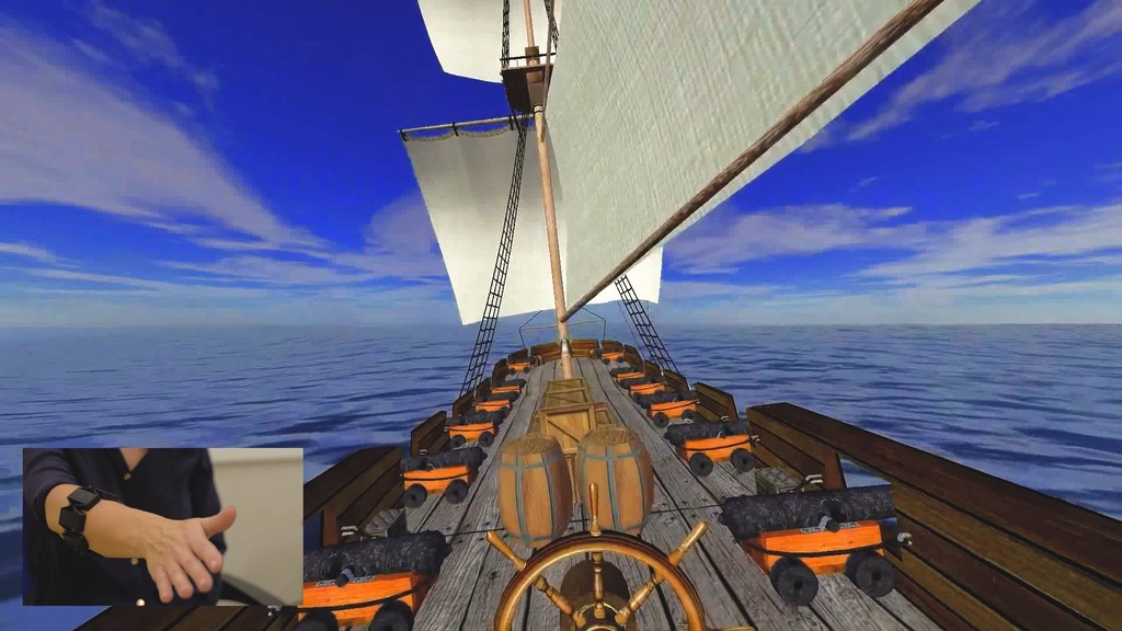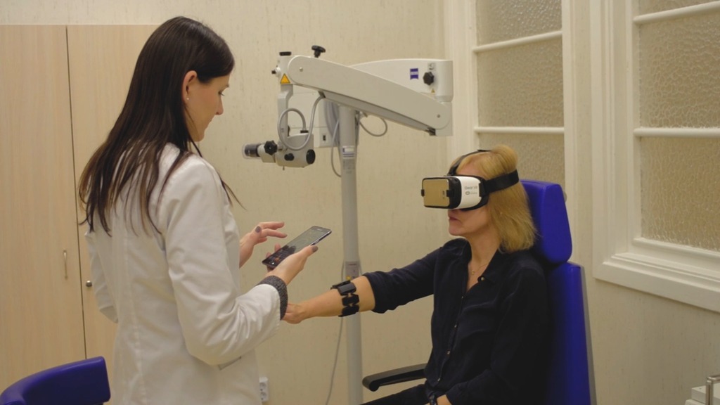 The system supports three different input methods for the patient to manipulate the visual vertical: a dance mat, the “Myo” armband, and either the “Gear VR” or “Oculus Go” controller. The patient can choose whichever device is most comfortable.